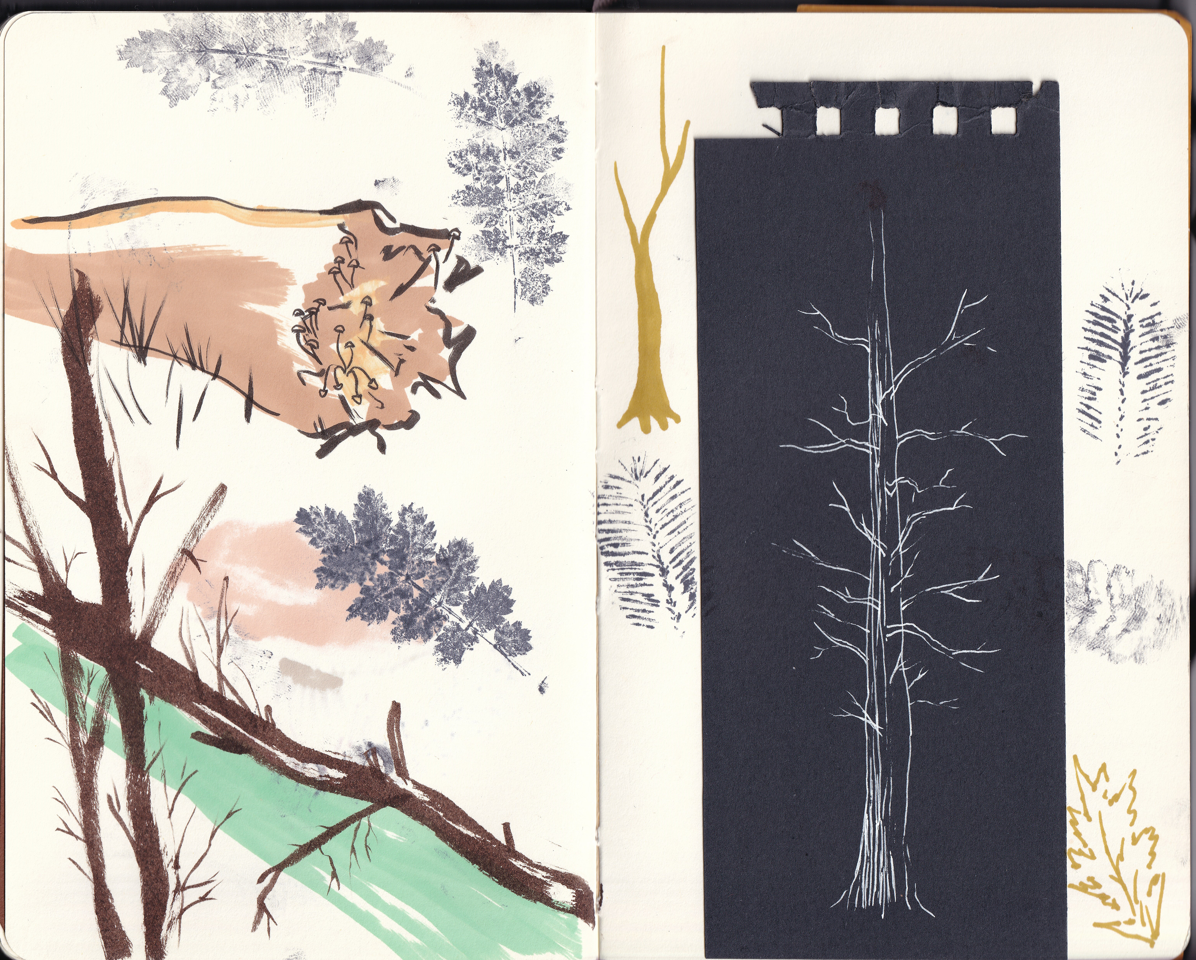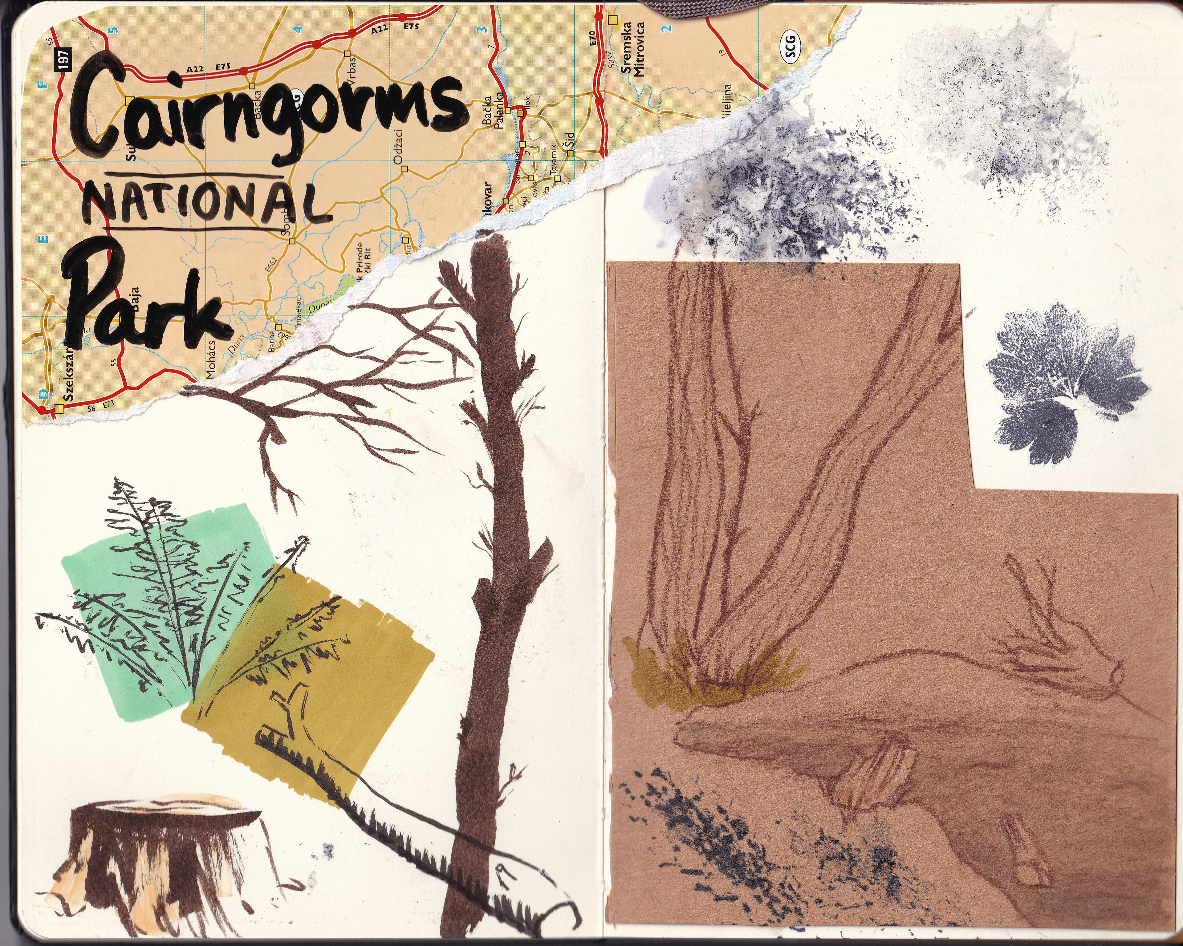 A selection of sketchbook pages, ranging from observational drawings and nature samples from the Cairngorms, to architectural studies of a pub and train station in Aberdeenshire.
